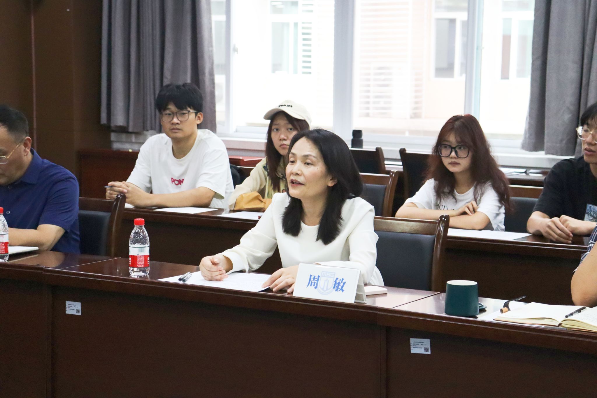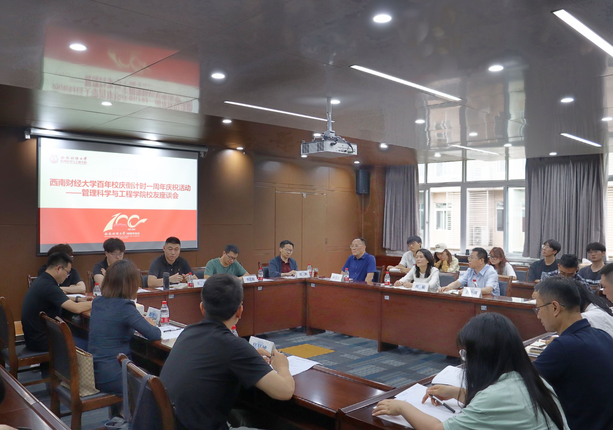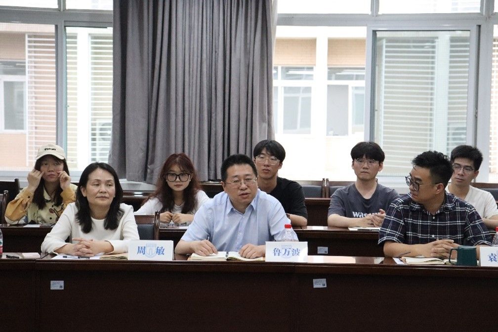 在通博楼D301会议室召开校友座谈会,校友代表师群昌、施敏、吴昊然重返校园,为母校送上祝福,学院党委书记周敏、院长鲁万波、党委副书记袁程炜、副院长肖辉、教师与学生代表出席会议。会议由周敏主持。