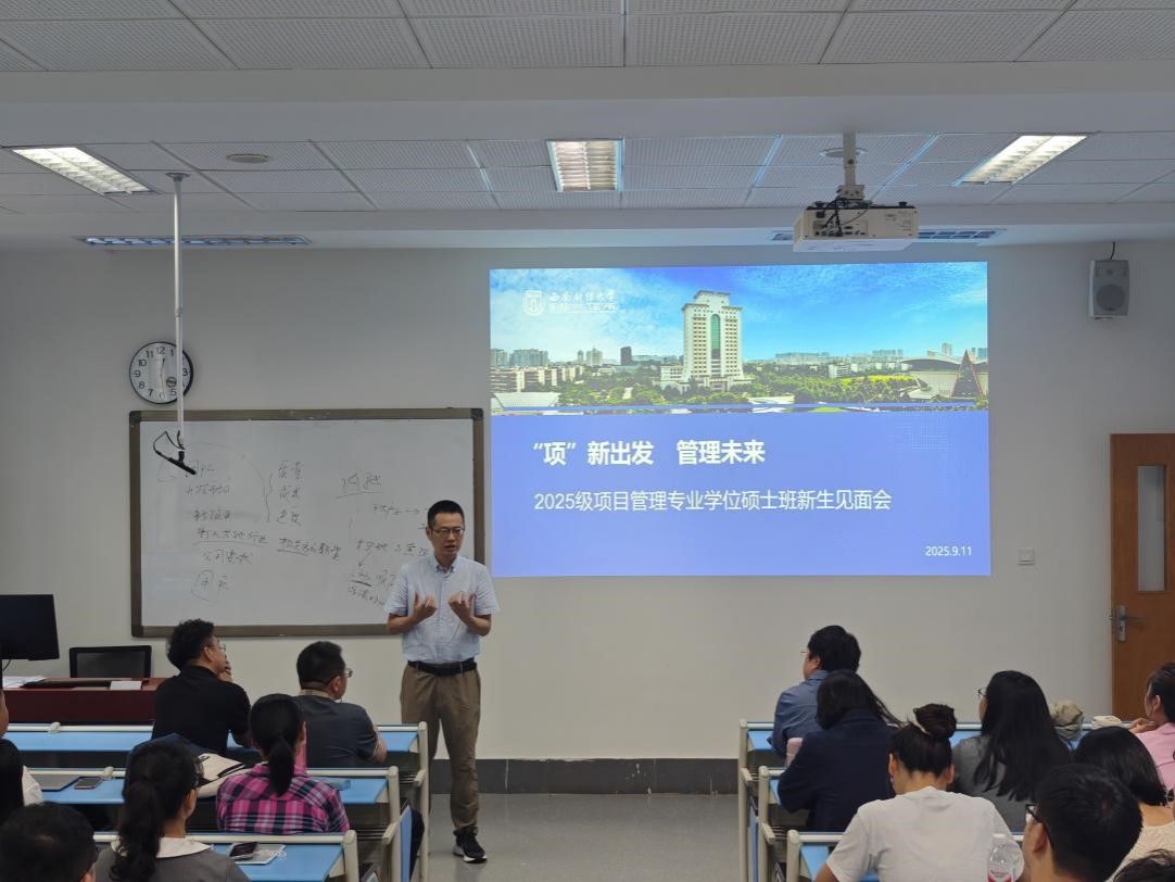 在光华裙楼2201召开 2025 级项目管理专业硕士新生见面会。学院院长鲁万波、副院长王宇、党委副书记兼纪委书记袁程炜、工程管理硕士教育中心主任张红历、教学秘书周轩莹及全体 2025 级项目管理专业硕士新生共同参会。