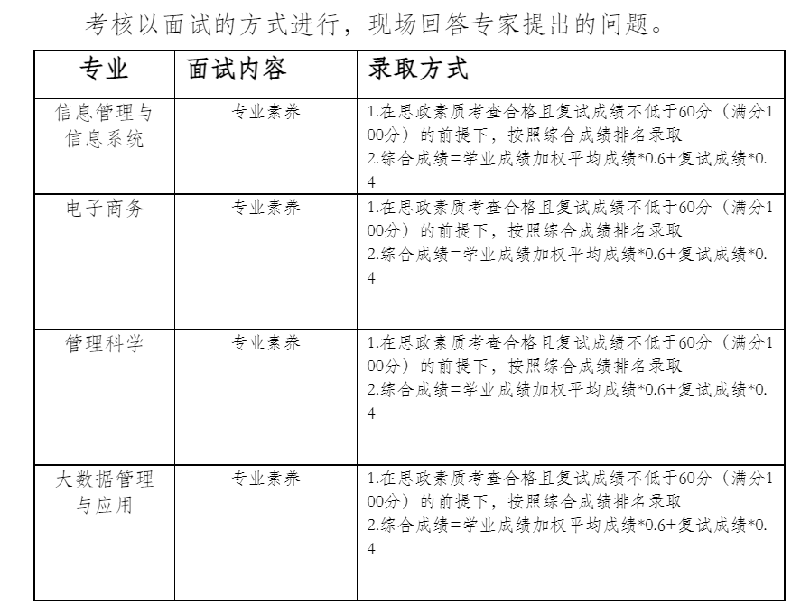 3.面试程序:考生先向工作人员出示学生证或身份证,然后进行自述,即席回答专家提出的问题。